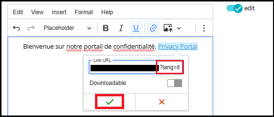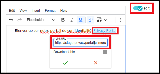 • If the link is placed in the header, first enable the "Edit" toggle, then click on "Privacy Portal" to make the necessary changes.