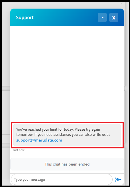 • If you have any attachments related to the issue, you can send them to "support@merudata.com" using the Ticket ID as a reference. Please note that files cannot be attached directly in the chat, so we provide this email address for submitting any supporting documents.