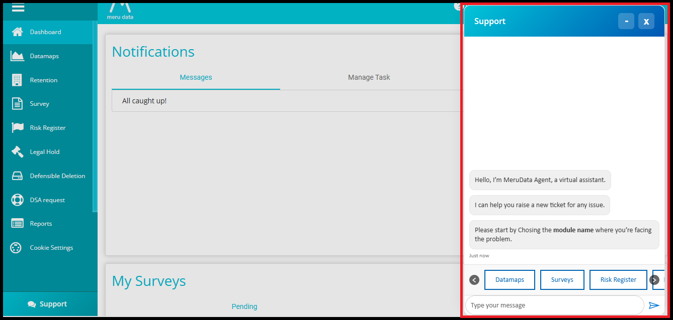 • After clicking the Support button, the MeruData Agent, a virtual assistant will open on the right side of your current page, allowing you to interact and raise a ticket for any issue.