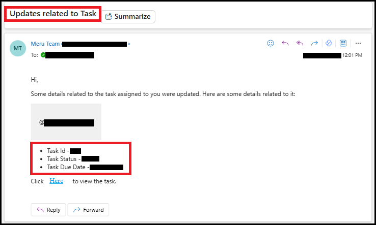 When a user updates the task, the tagged user will receive an email notification. This email includes details such as Task ID, updated Task Status, and Task Due Date, along with a link to view the task.