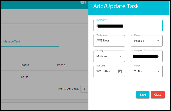 b. After making changes, click Save to update the task or Close to exit without saving.
