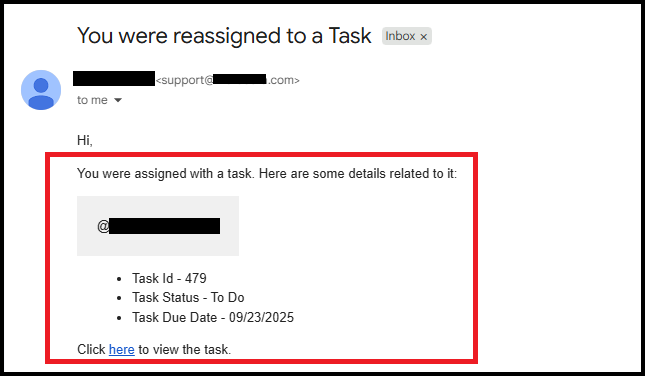 - After reassignment: The previous assignee receives an email stating: "You were removed from the task."