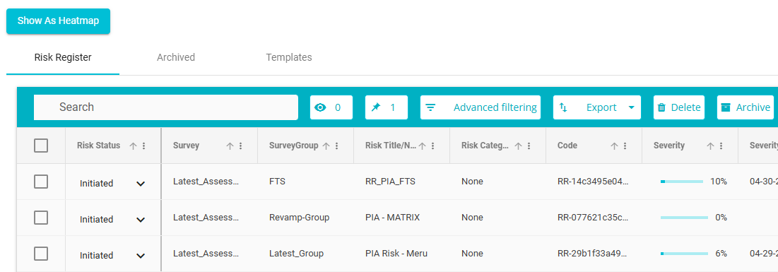 All risks created can be viewed and accessed from the Risk Register. The Risk Register provides a comprehensive view of all risks and their details in the form of a heatmap as well as in a tabular form.