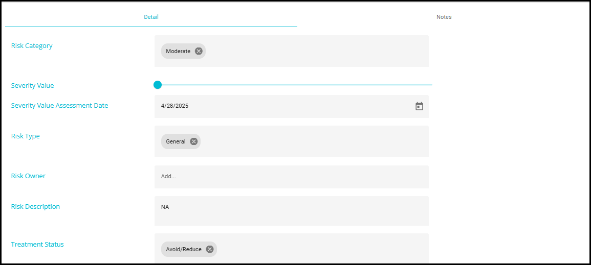 - Severity Value Assessment Date: Select the date on which the risk severity was assessed.