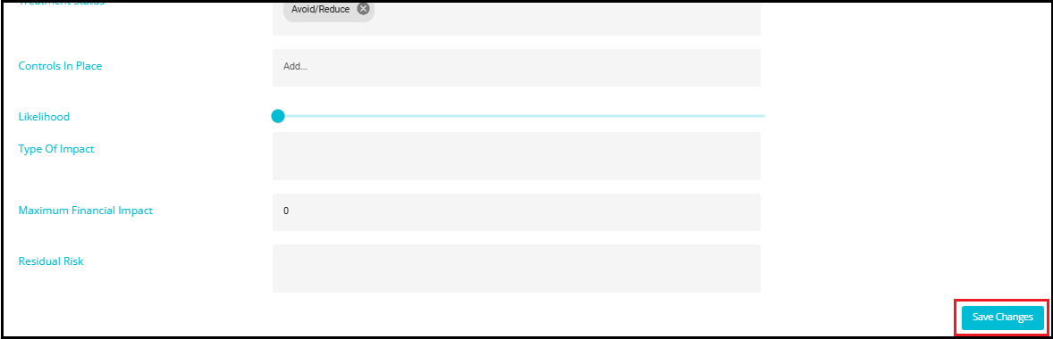 - Treatment Status: Users can select a treatment status from the predefined dropdown options to indicate how the risk is being managed. Additionally, after the risk register is created, users can enter custom values for this field to better reflect unique or organization-specific treatment approaches.