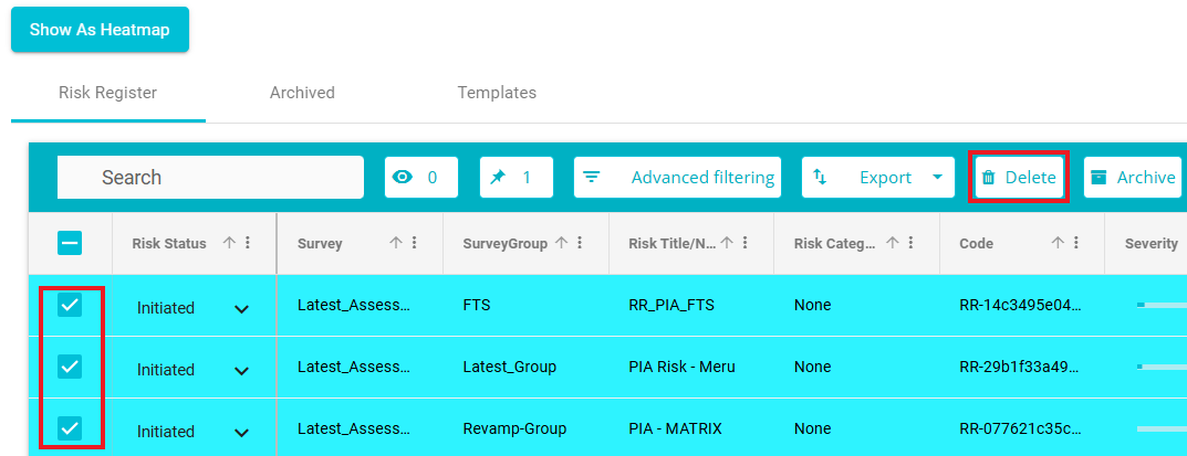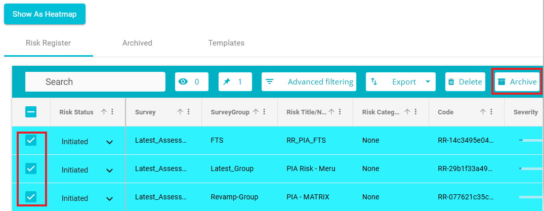 - User also can perform bulk delete by selecting the required Risks and clicking on archive button.