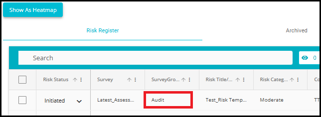 - Clicking on a survey group name will take you directly to the associated survey and open the corresponding risk register in the View Answer screen for detailed review.