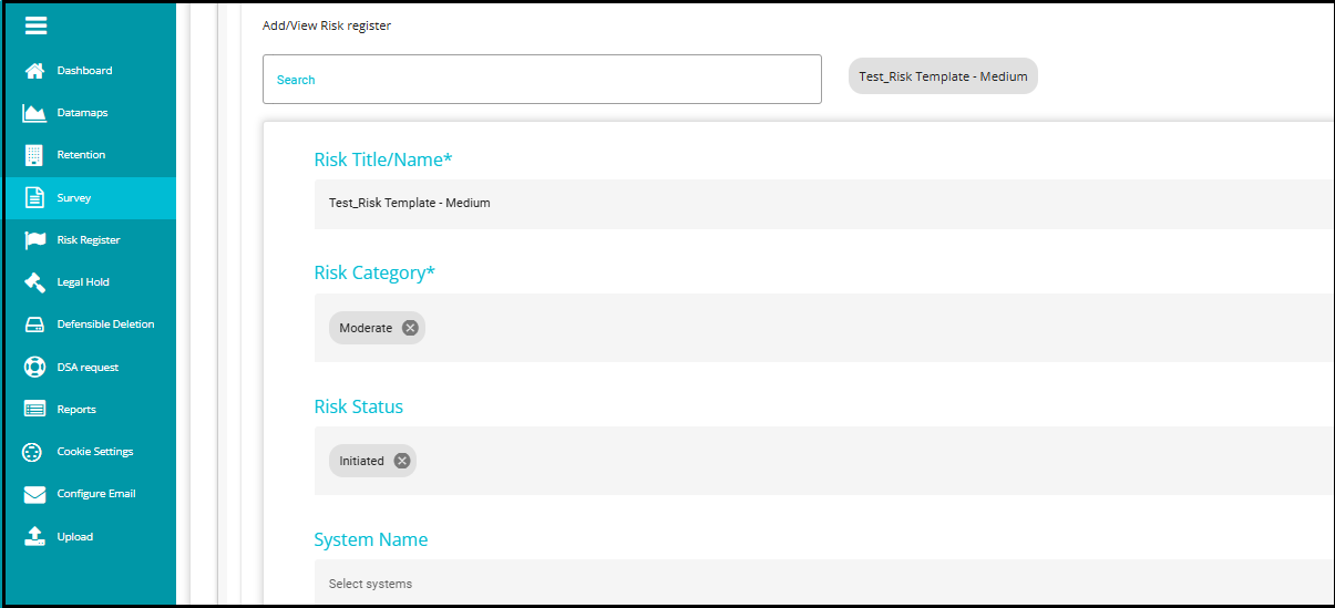 Users can add Risks to survey answers whenever applicable. These risks along with their details such as the name of the System it is applicable to, the severity of the risk and so forth are added to an overall risk register.