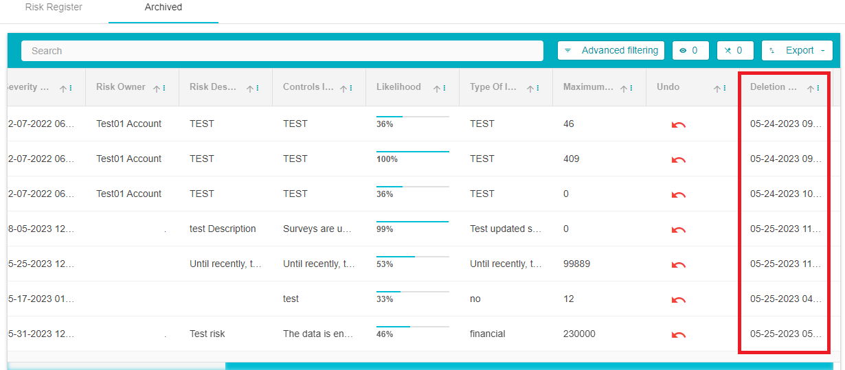 - The configuration to delete depends on the Deletion Date of the risk. The Deletion Date is the date on which the risk was moved to the Archived table. The Deletion Date can be found by scrolling to the right of the Archived Table.