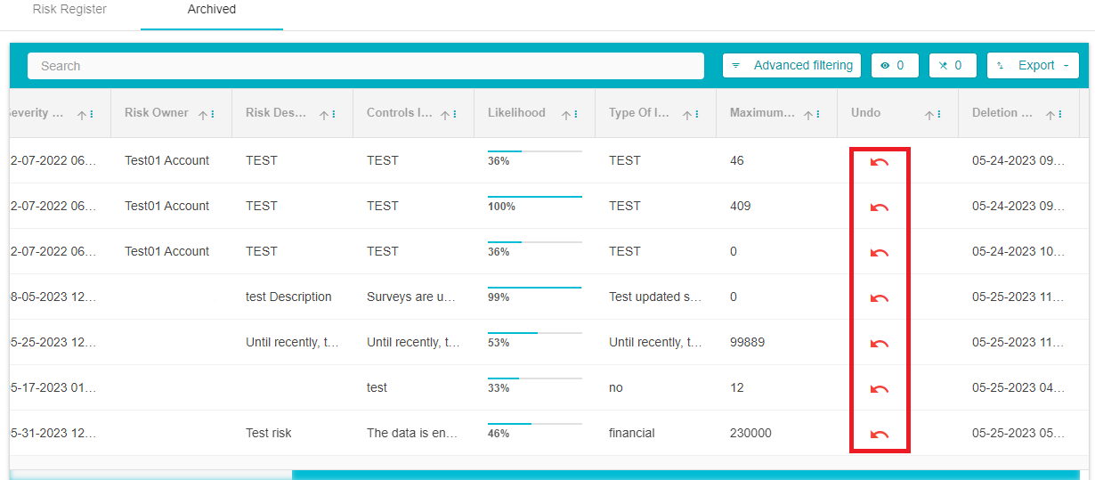 *Note: Risks from the Archived table will be permanently deleted after a certain period. This period is determined by the configuration made on the Delete Configuration page. If for example, the configuration is set to 3 years, then the archived risks will be deleted automatically after being present on the Archived table for 3 years.