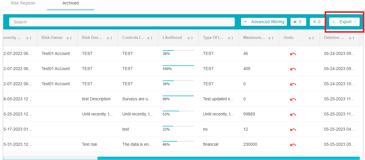The contents of both tables -- Risk Register and Archived can be exported in an Excel or CSV format by clicking the Export button found at the top right of the table.