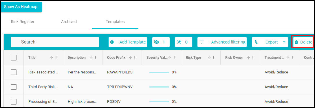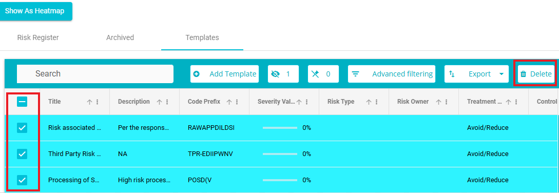 - User also can perform bulk delete by selecting the required Risks and clicking on delete button.