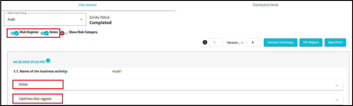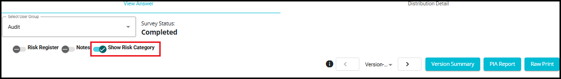 - Here you can view the answers of the survey along with associated systems and any notes or risks added to them. The risk category, which is configured based on the survey score can also be seen here on enabling the Show Risk Category toggle.