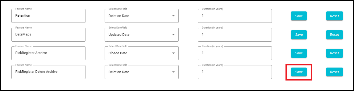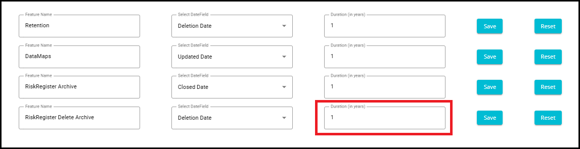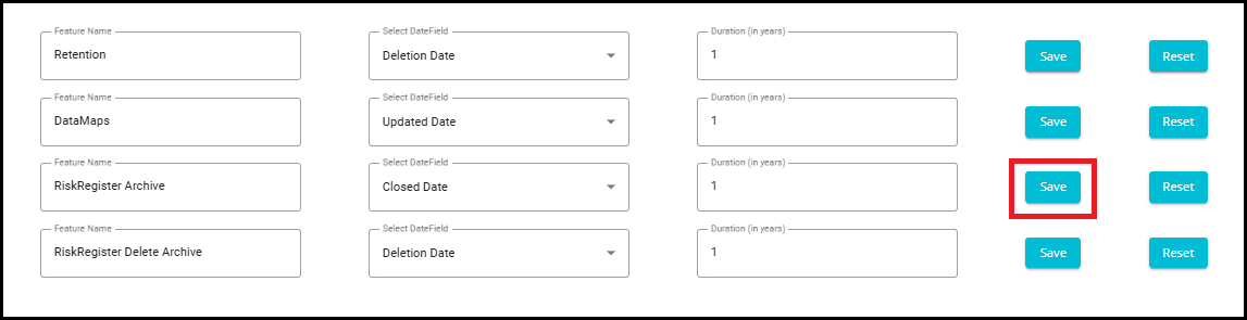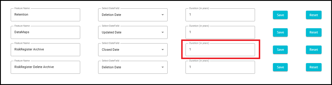 - Risk Register Delete Archive: Here you can configure when the risks present on the Archived table will be permanently deleted. The delete config duration will be counted from the Deletion Date. The Deletion Date is the date on which the risk was moved to the Archived table.